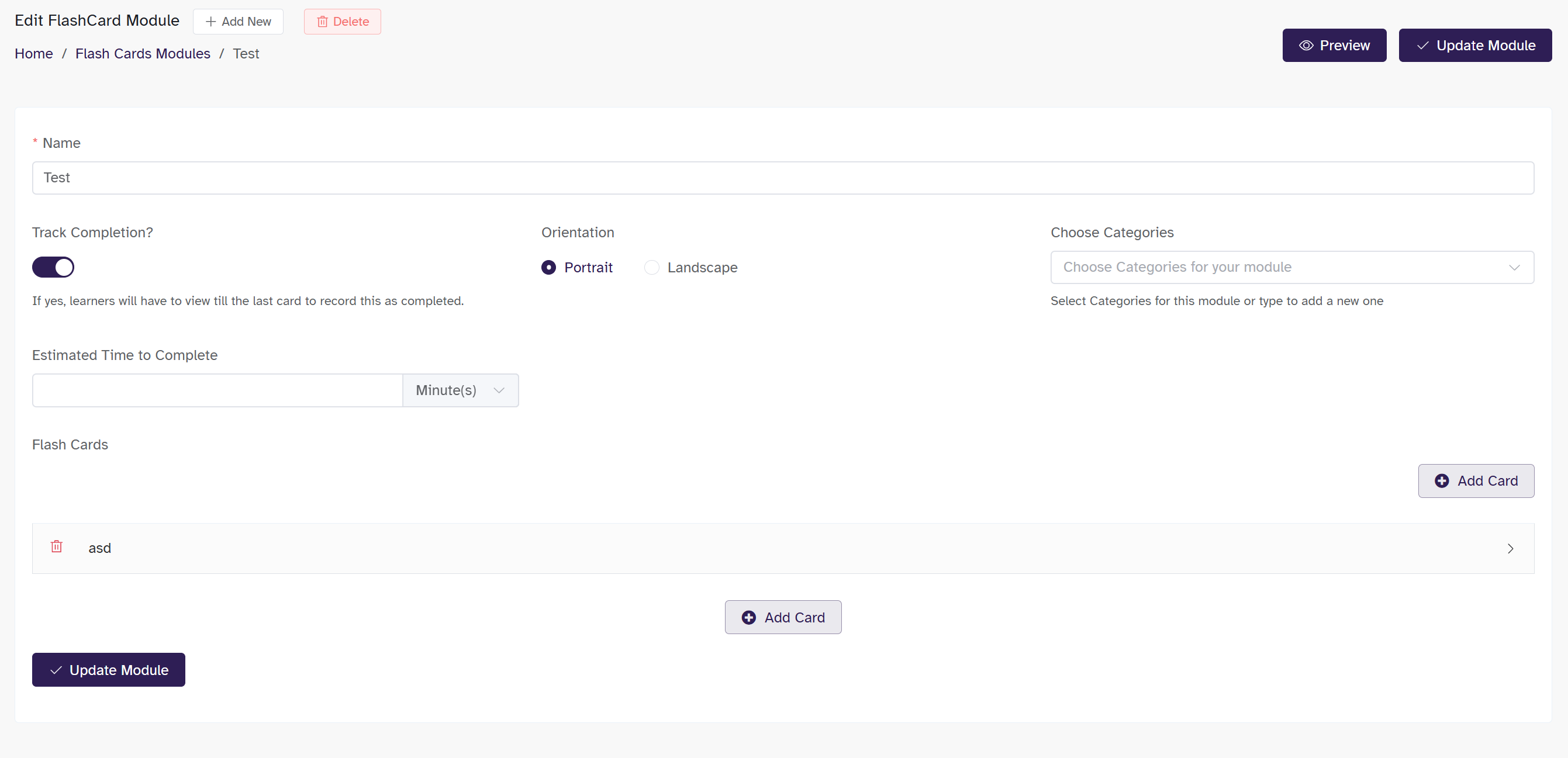 - Enabling Track Completion? will ensure that the learner must view all flash cards to complete the module.