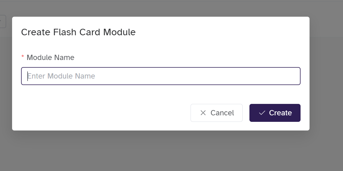 Click Create Flash Cards Module. A pop-up window will appear. Enter the Module Name, then click Create to add the Flash Cards module.