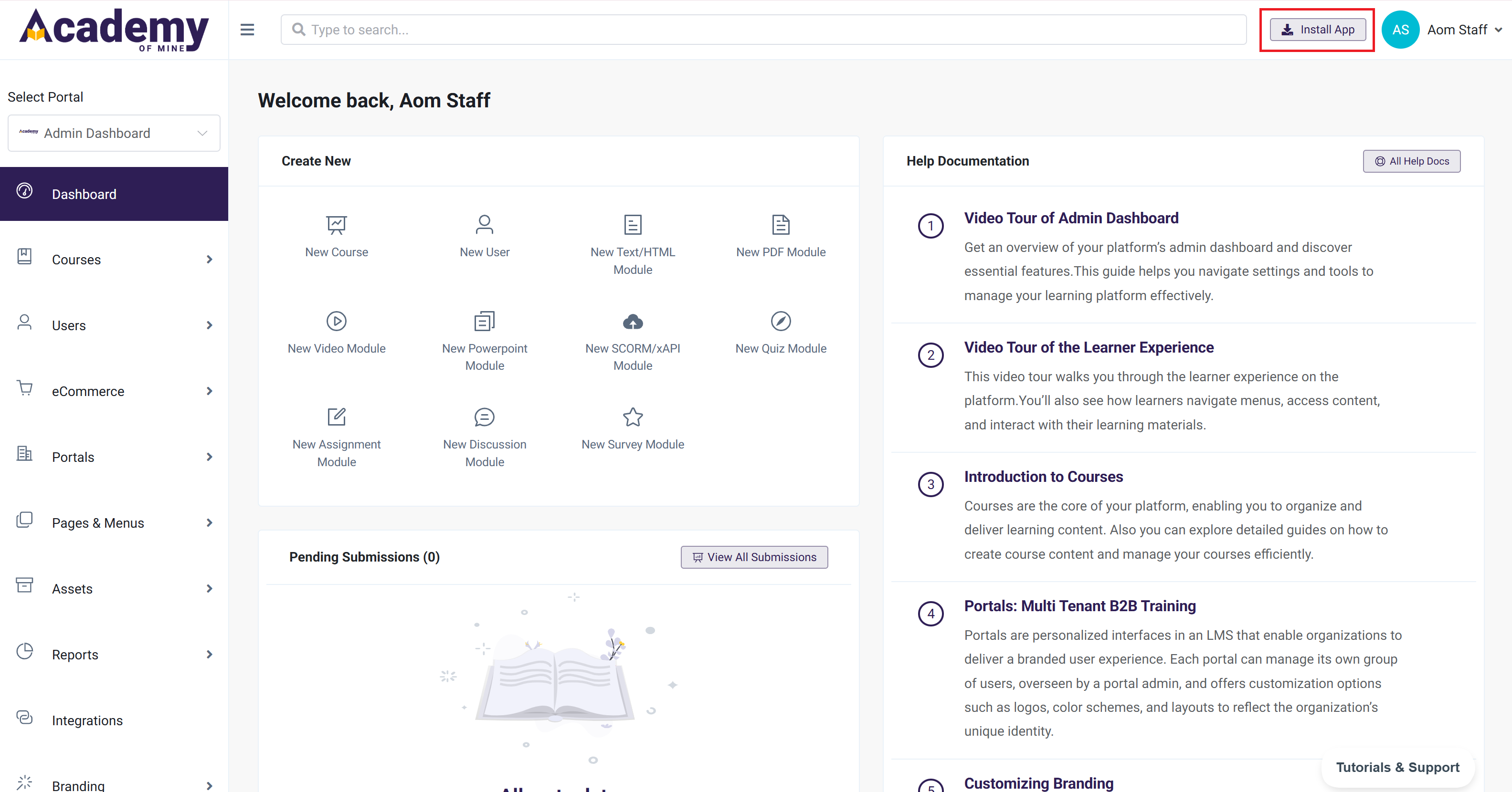 On desktop browsers such as Chrome or Firefox, users will see an “Install App” button displayed in the application header, located between the search bar and the profile menu.